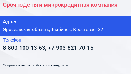 СрочноДеньги, микрокредитная компания по адресу Ярославская область, Рыбинск, Крестовая, 32 в дальнейшем Организация, размещена в следующих категориях: