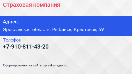 Страховая компания по адресу Ярославская область, Рыбинск, Крестовая, 59 в дальнейшем Организация, размещена в следующих категориях: