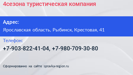 4сезона, туристическая компания по адресу Ярославская область, Рыбинск, Крестовая, 41 в дальнейшем Организация, размещена в следующих категориях: