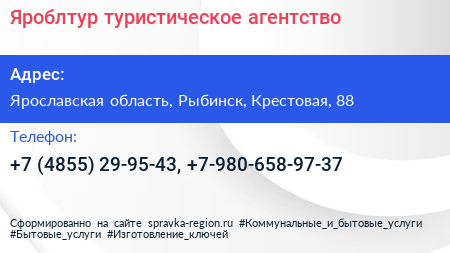 Яроблтур, туристическое агентство по адресу Ярославская область, Рыбинск, Крестовая, 88 в дальнейшем Организация, размещена в следующих категориях: