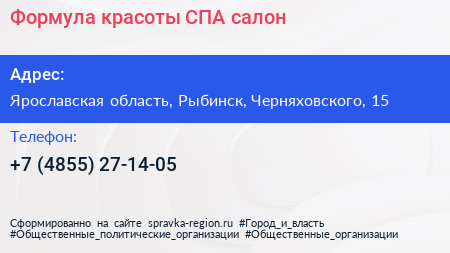 Формула красоты, СПА-салон по адресу Ярославская область, Рыбинск, Черняховского, 15 в дальнейшем Организация, размещена в следующих категориях:
