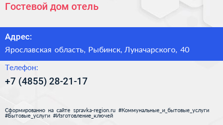Гостевой дом, отель по адресу Ярославская область, Рыбинск, Луначарского, 40 в дальнейшем Организация, размещена в следующих категориях: