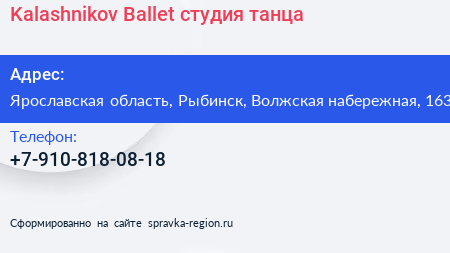 Kalashnikov-Ballet, студия танца по адресу Ярославская область, Рыбинск, Волжская набережная, 163 в дальнейшем Организация, размещена в следующих категориях: