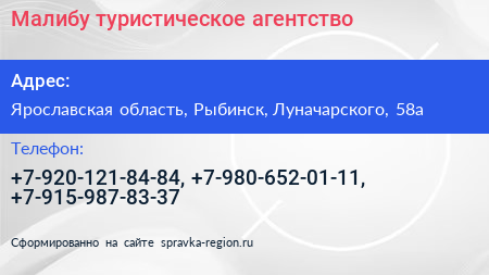 Малибу, туристическое агентство по адресу Ярославская область, Рыбинск, Луначарского, 58а в дальнейшем Организация, размещена в следующих категориях: