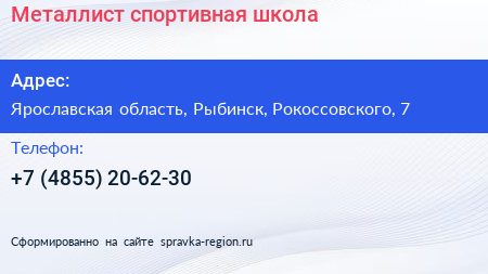 Металлист, спортивная школа по адресу Ярославская область, Рыбинск, Рокоссовского, 7 в дальнейшем Организация, размещена в следующих категориях: