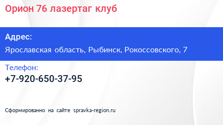 Орион 76, лазертаг-клуб по адресу Ярославская область, Рыбинск, Рокоссовского, 7 в дальнейшем Организация, размещена в следующих категориях: