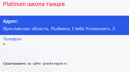Platinum, школа танцев по адресу Ярославская область, Рыбинск, Глеба Успенского, 2 в дальнейшем Организация, размещена в следующих категориях: