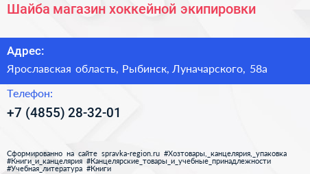 Шайба, магазин хоккейной экипировки по адресу Ярославская область, Рыбинск, Луначарского, 58а в дальнейшем Организация, размещена в следующих категориях: