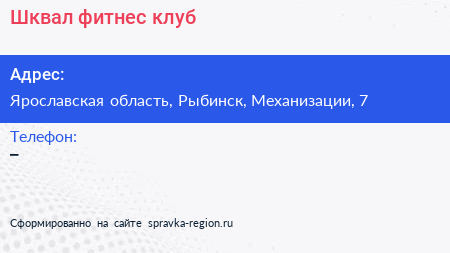 Шквал, фитнес-клуб по адресу Ярославская область, Рыбинск, Механизации, 7 в дальнейшем Организация, размещена в следующих категориях: