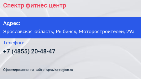 Спектр, фитнес-центр по адресу Ярославская область, Рыбинск, Моторостроителей, 29а в дальнейшем Организация, размещена в следующих категориях: