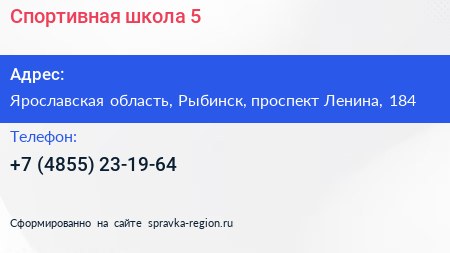 Спортивная школа №5 по адресу Ярославская область, Рыбинск, проспект Ленина, 184 в дальнейшем Организация, размещена в следующих категориях: