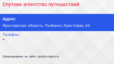 Спутник, агентство путешествий по адресу Ярославская область, Рыбинск, Крестовая, 62 в дальнейшем Организация, размещена в следующих категориях: