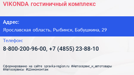 VIKONDA, гостиничный комплекс по адресу Ярославская область, Рыбинск, Бабушкина, 29 в дальнейшем Организация, размещена в следующих категориях: