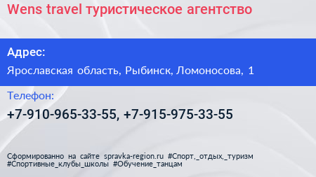Wens travel, туристическое агентство по адресу Ярославская область, Рыбинск, Ломоносова, 1 в дальнейшем Организация, размещена в следующих категориях:
