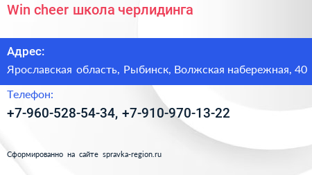 Win cheer, школа черлидинга по адресу Ярославская область, Рыбинск, Волжская набережная, 40 в дальнейшем Организация, размещена в следующих категориях: