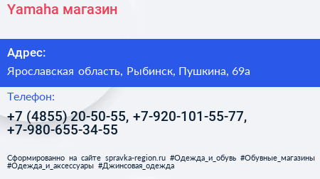 Yamaha, магазин по адресу Ярославская область, Рыбинск, Пушкина, 69а в дальнейшем Организация, размещена в следующих категориях:
