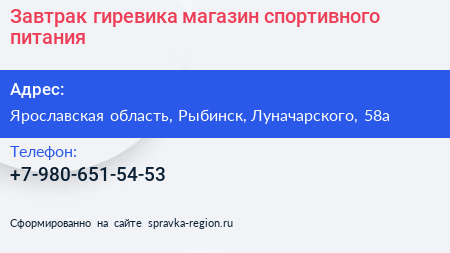 Завтрак гиревика, магазин спортивного питания по адресу Ярославская область, Рыбинск, Луначарского, 58а в дальнейшем Организация, размещена в следующих категориях: