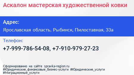 Аскалон, мастерская художественной ковки по адресу Ярославская область, Рыбинск, Пилоставная, 33а в дальнейшем Организация, размещена в следующих категориях: