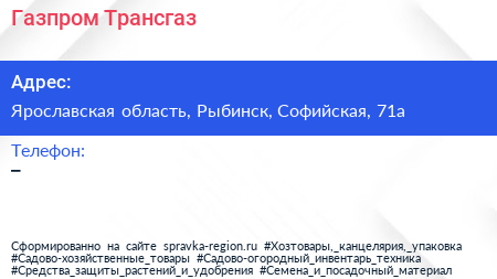 Газпром Трансгаз по адресу Ярославская область, Рыбинск, Софийская, 71а в дальнейшем Организация, размещена в следующих категориях:
