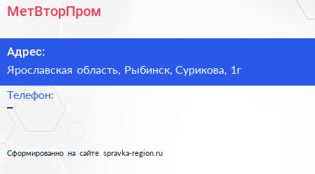 МетВторПром по адресу Ярославская область, Рыбинск, Сурикова, 1г в дальнейшем Организация, размещена в следующих категориях: