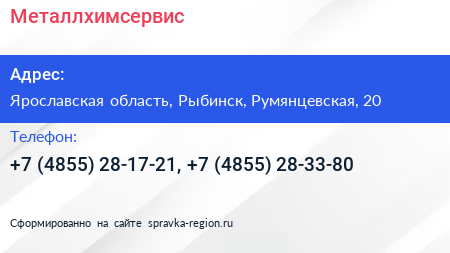 Металлхимсервис по адресу Ярославская область, Рыбинск, Румянцевская, 20 в дальнейшем Организация, размещена в следующих категориях: