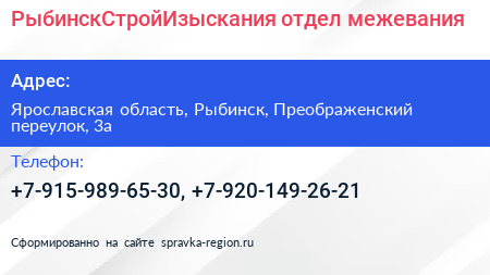 РыбинскСтройИзыскания, отдел межевания по адресу Ярославская область, Рыбинск, Преображенский переулок, 3а в дальнейшем Организация, размещена в следующих категориях: