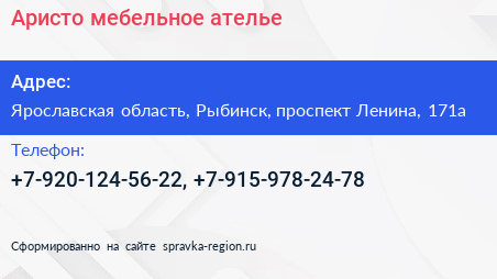 Аристо, мебельное ателье по адресу Ярославская область, Рыбинск, проспект Ленина, 171а в дальнейшем Организация, размещена в следующих категориях: