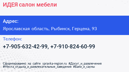 ИДЕЯ, салон мебели по адресу Ярославская область, Рыбинск, Герцена, 93 в дальнейшем Организация, размещена в следующих категориях: