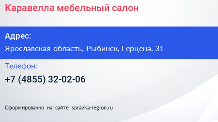 Каравелла, мебельный салон по адресу Ярославская область, Рыбинск, Герцена, 31 в дальнейшем Организация, размещена в следующих категориях: