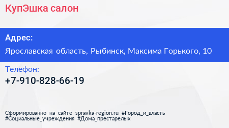 КупЭшка, салон по адресу Ярославская область, Рыбинск, Максима Горького, 10 в дальнейшем Организация, размещена в следующих категориях: