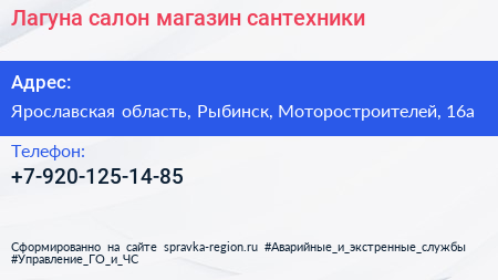 Лагуна, салон-магазин сантехники по адресу Ярославская область, Рыбинск, Моторостроителей, 16а в дальнейшем Организация, размещена в следующих категориях: