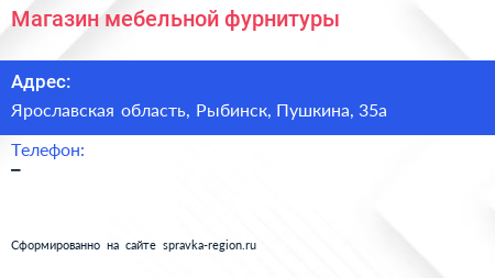 Магазин мебельной фурнитуры по адресу Ярославская область, Рыбинск, Пушкина, 35а в дальнейшем Организация, размещена в следующих категориях: