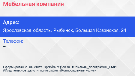 Мебельная компания по адресу Ярославская область, Рыбинск, Большая Казанская, 24 в дальнейшем Организация, размещена в следующих категориях: