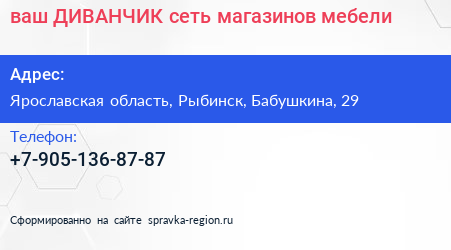 ваш ДИВАНЧИК, сеть магазинов мебели по адресу Ярославская область, Рыбинск, Бабушкина, 29 в дальнейшем Организация, размещена в следующих категориях: