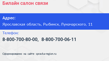 Билайн, салон связи по адресу Ярославская область, Рыбинск, Луначарского, 11 в дальнейшем Организация, размещена в следующих категориях: