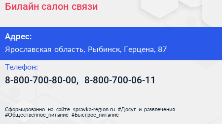 Билайн, салон связи по адресу Ярославская область, Рыбинск, Герцена, 87 в дальнейшем Организация, размещена в следующих категориях: