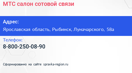МТС, салон сотовой связи по адресу Ярославская область, Рыбинск, Луначарского, 58а в дальнейшем Организация, размещена в следующих категориях: