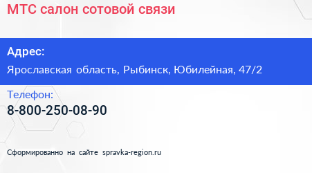 МТС, салон сотовой связи по адресу Ярославская область, Рыбинск, Юбилейная, 47/2 в дальнейшем Организация, размещена в следующих категориях: