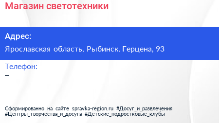 Магазин светотехники по адресу Ярославская область, Рыбинск, Герцена, 93 в дальнейшем Организация, размещена в следующих категориях: