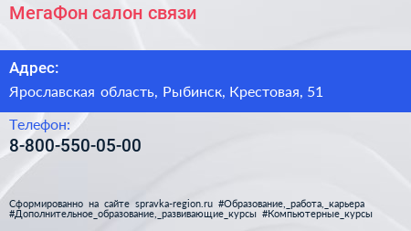 МегаФон, салон связи по адресу Ярославская область, Рыбинск, Крестовая, 51 в дальнейшем Организация, размещена в следующих категориях: