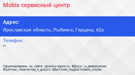 Mobis, сервисный центр по адресу Ярославская область, Рыбинск, Герцена, 62а в дальнейшем Организация, размещена в следующих категориях: