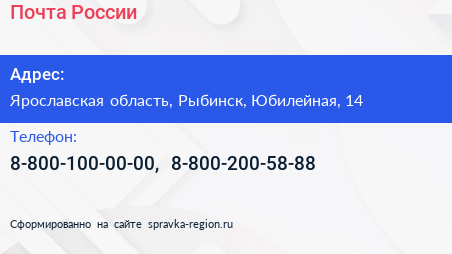 Почта России по адресу Ярославская область, Рыбинск, Юбилейная, 14 в дальнейшем Организация, размещена в следующих категориях: