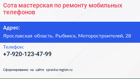 Сота, мастерская по ремонту мобильных телефонов по адресу Ярославская область, Рыбинск, Моторостроителей, 28 в дальнейшем Организация, размещена в следующих категориях: