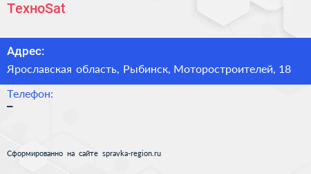 ТехноSat по адресу Ярославская область, Рыбинск, Моторостроителей, 18 в дальнейшем Организация, размещена в следующих категориях:
