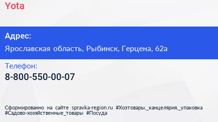 Yota по адресу Ярославская область, Рыбинск, Герцена, 62а в дальнейшем Организация, размещена в следующих категориях: