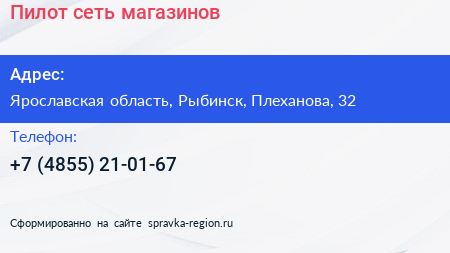 Пилот, сеть магазинов по адресу Ярославская область, Рыбинск, Плеханова, 32 в дальнейшем Организация, размещена в следующих категориях: