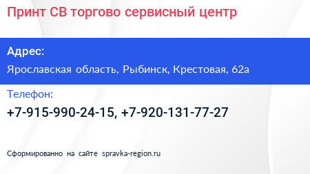 Принт-СВ, торгово-сервисный центр по адресу Ярославская область, Рыбинск, Крестовая, 62а в дальнейшем Организация, размещена в следующих категориях: