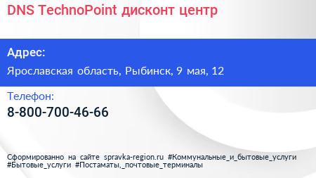 DNS TechnoPoint, дисконт-центр по адресу Ярославская область, Рыбинск, 9 мая, 12 в дальнейшем Организация, размещена в следующих категориях: