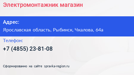Электромонтажник, магазин по адресу Ярославская область, Рыбинск, Чкалова, 64а в дальнейшем Организация, размещена в следующих категориях: