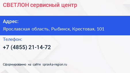 СВЕТЛОН, сервисный центр по адресу Ярославская область, Рыбинск, Крестовая, 101 в дальнейшем Организация, размещена в следующих категориях: